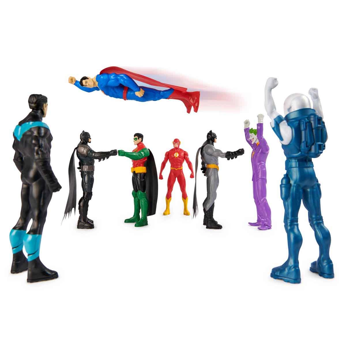 Se junte com os personagens mais famosos do mundo da DC Comics!Escolha entre o cavaleiro das trevas Batman, o garoto prodigio Robin, o homen de aço Superman, o defensor de bludhaven Asa Noturna, o velocista escarlate Flash e até mesmo vilões como Sr. Frio e o palhaço principe do caos Coringa! As figuras são altamente detalhadas e articuladas para deixar a sua experiência ainda mais emocionante e única! Brinque com os seus personagens favoritos e tenha uma diversão sem fim!