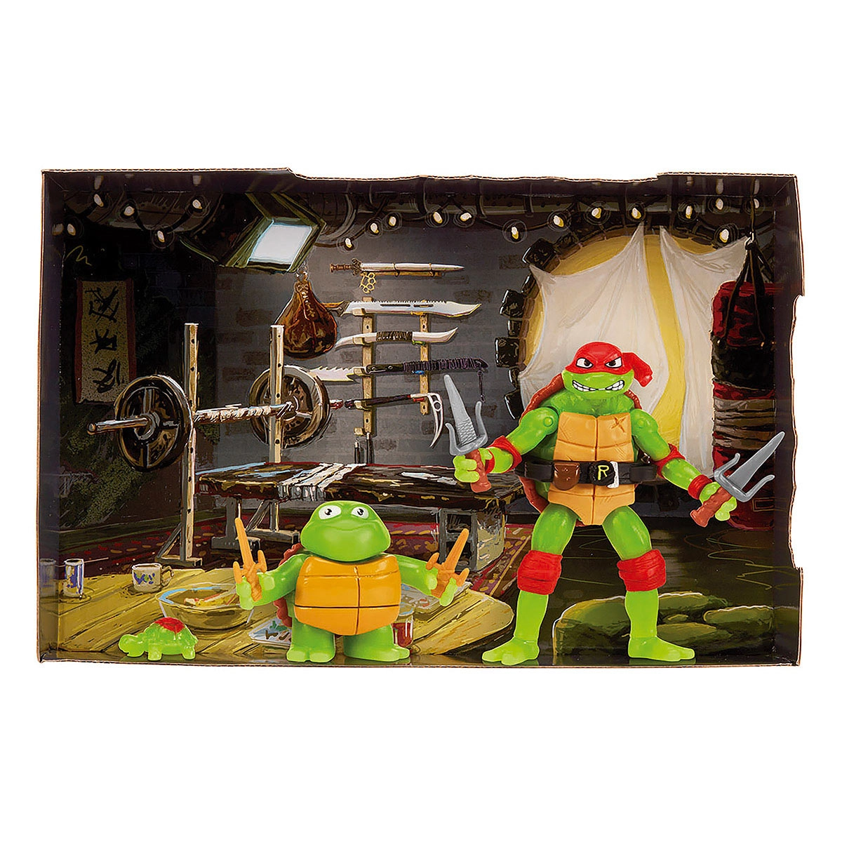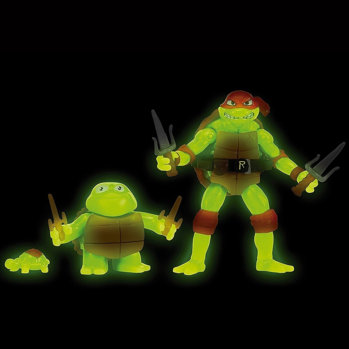 Quando as Tartarugas caem no esgoto e são encharcadas com um lodo misterioso, elas se transformam em crescentes e brilhantes Tartarugas Ninja! Veja a evolução de sua Tartaruga Ninja favorita! Todas as 3 Tartarugas neste pacote vêm com um toque especial - à noite elas se iluminam e brilham no escuro, um efeito colateral do lodo mutagênico! Alem disso, o conjunto vem embalado em uma caixa com um cenário ilustrado altamente detalhado do dojo de treinamento das Tartarugas!