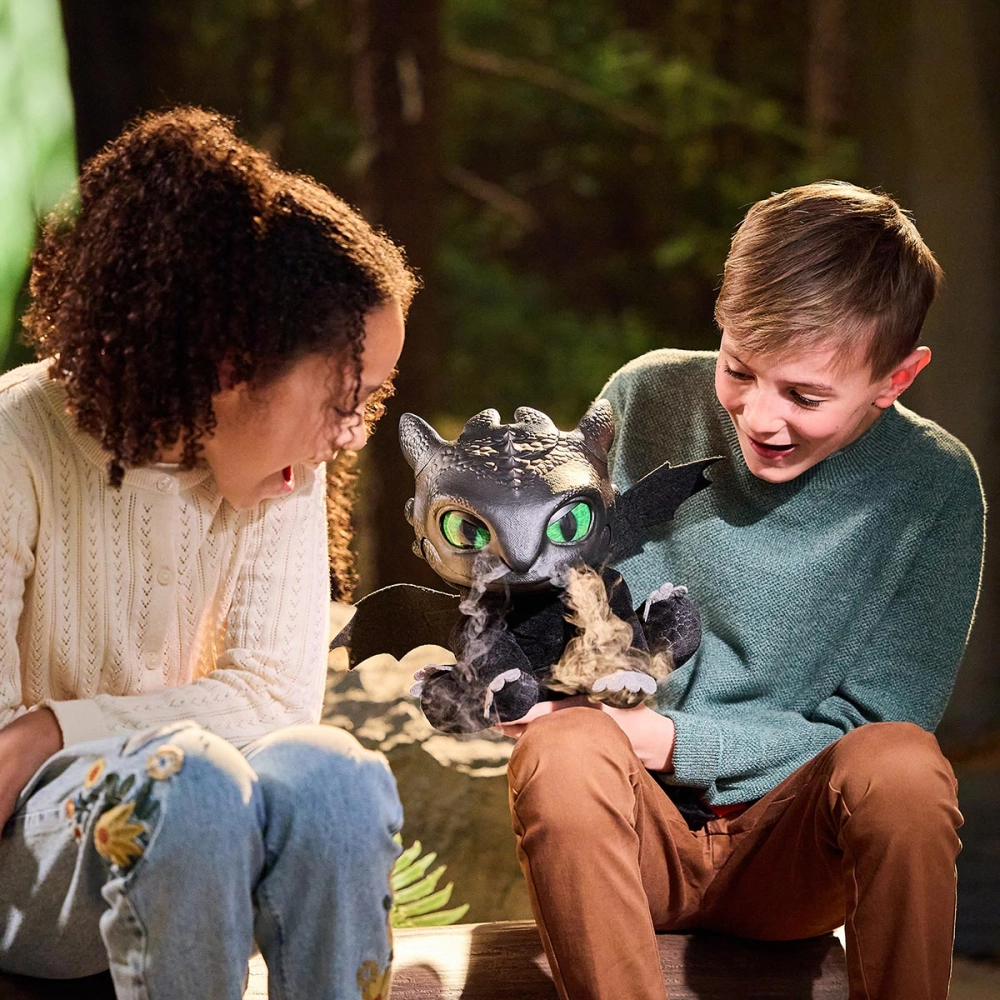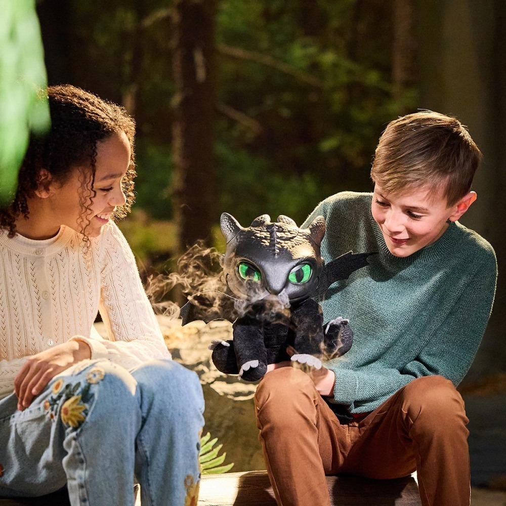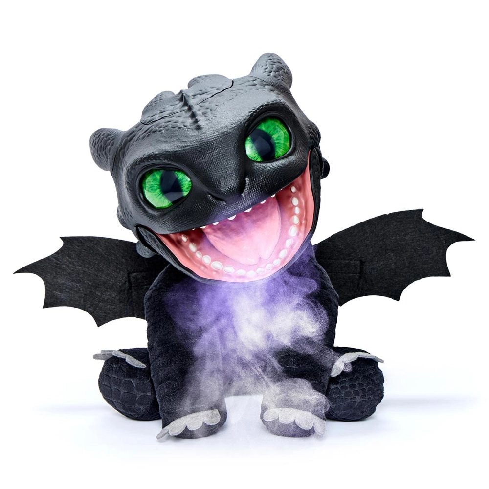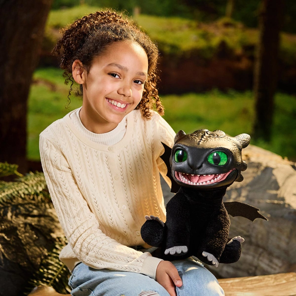 A pelúcia interativa da Universal DreamWorks, desenvolvida pela WOW! Stuff, une marionetagem e robótica para dar vida ao Banguela. Com mais de 50 frases e sons autênticos do filme, sua boca e cabeça se movem e reagem ao toque. Libera rajada de plasma em formato de luz e fumaça de dragão pelo nariz e boca. É possível alterar os humores de Banguela (carinhoso, protetor ou bravo) com três botões. Com 26 cm, é perfeita para abraços, brincadeiras e admiradores de Como Treinar o Seu Dragão de todas as idades. REGISTRO 018065/2024 BRI-1