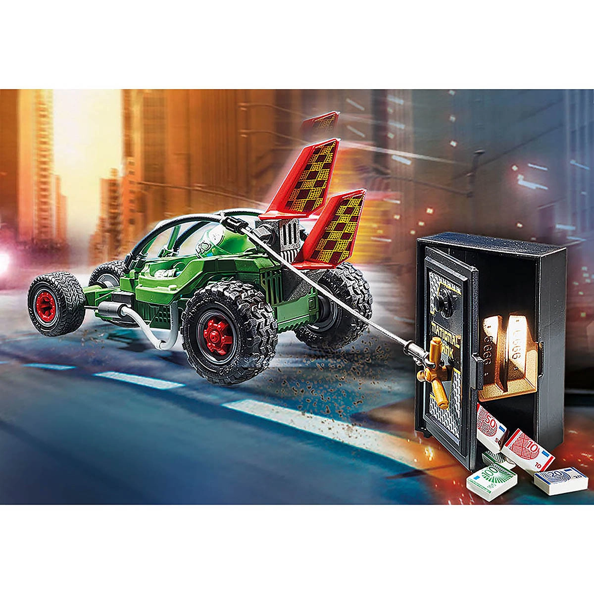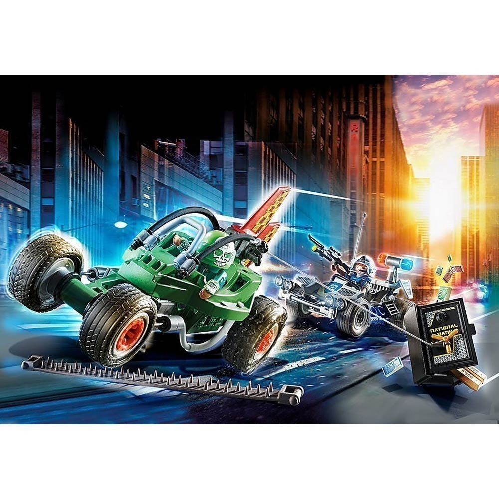 É hora de uma emocionante perseguição de carro com o Police Go-Kart Escape!Ambos os veículos estão equipados com um motor de recuo para dar vida à açãoO conjunto inclui duas figuras, quad policial, kart, cofre com dinheiro e barras de ouro, espigões de estrada e outros acessóriosRecomendado para idades de quatro a dez anos. Aviso. Perigo de asfixia. Peças pequenas. Não para crianças menores de 3 anos