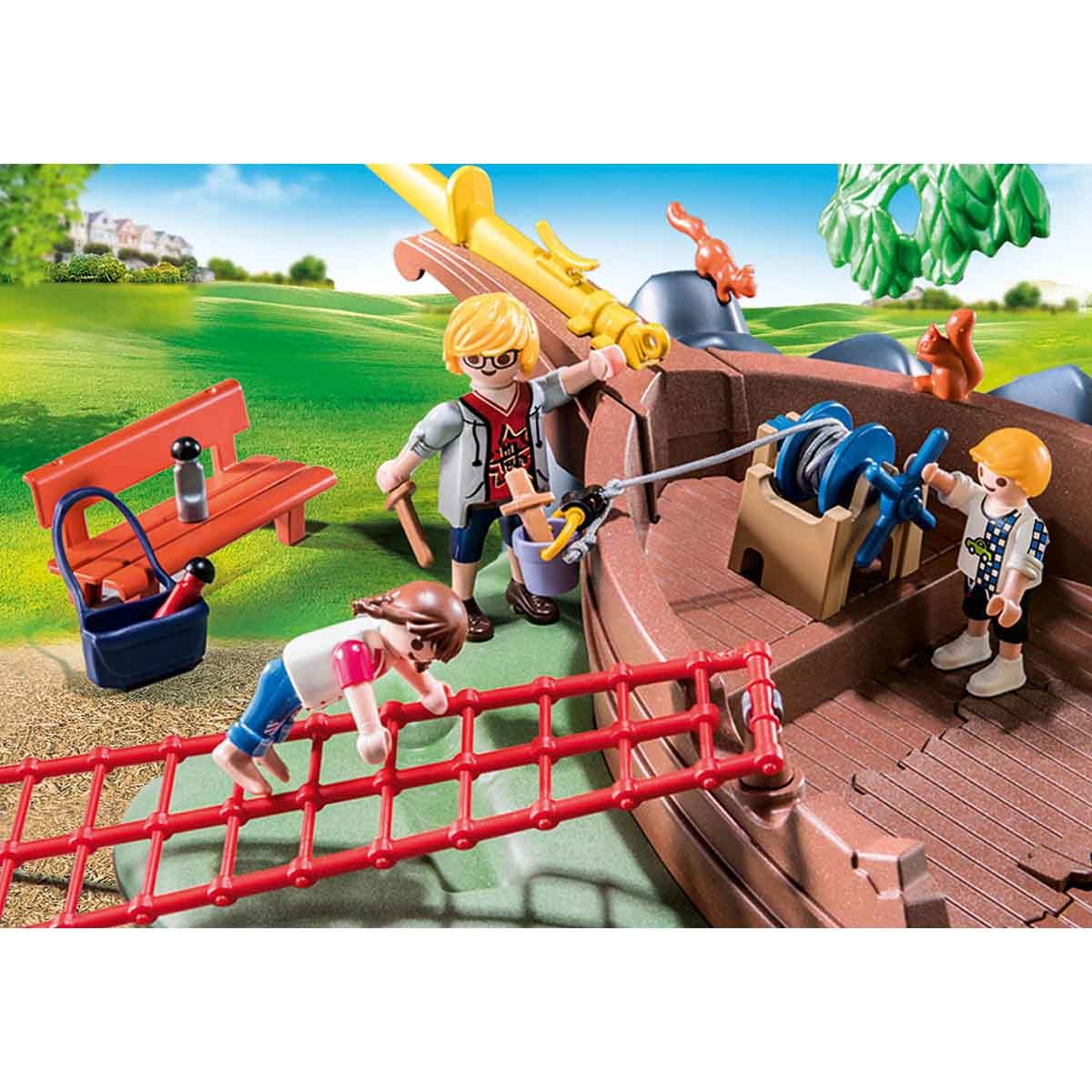 Enquanto as crianças correm alegremente, papai se acomoda no banco. Mas o resto não dura muito, logo ele também brinca de pegar quase tão animadamente quanto as crianças. O playset é composto por três figuras PLAYMOBIL um pai e dois filhos, um baloiço em forma de naufrágio, um baloiço, uma mola de balanço, um escorrega, uma scooter, brinquedos de areia e muitos outros extras para todos os fãs de lazer.