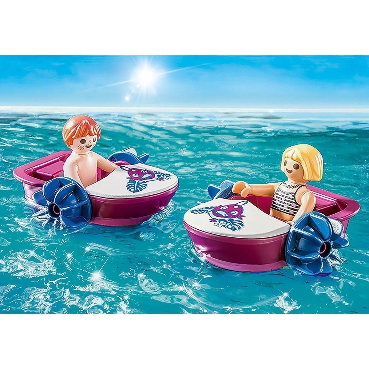 Divertimento de remo tropical: aluguel de pedalinho Playmobil com bar de sucos, bem como bardame, menina e menino para experimentar horas de banho divertidas