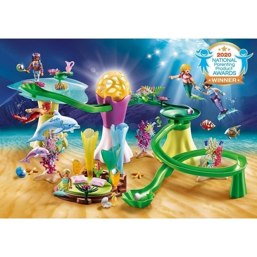 Diversão para meninas e meninos: PLAYMOBIL Mermaid Cove com Illuminated Dome, sereias e golfinhos flutuantes para um RPG preciso Com 5 pérolas para a faixa de pérolas para ativar a cúpula de luz, as pérolas podem ser guardadas no recipiente de pérolas ou nos corais, podem ser combinadas com PLAYMOBIL o salão de beleza com estojo para joias (70096 vendido separadamente) Conjunto de jogos para crianças a partir dos 4 anos, ideal para as mãos das crianças devido ao tamanho adequado à idade e fáceis de segurar graças às bordas arredondadas Pode ser usado todos os dias: Instruções de montagem com pais, Alta qualidade e design robusto, Limpe as peças (sem adesivos) em água corrente sem agentes químicos Conteúdo: 1x PLAYMOBIL Magic Mermaid Cove com Illuminated Dome, conjunto de jogos de 126 peças com instruções: 1 Mermaid Cove com Illuminated Dome, 5 figuras, 120 acessórios (3 pilhas de 1,5 V não incluídas), Material: Plástico, C x L x A: 62 x 30 x 22 cm, 70094.