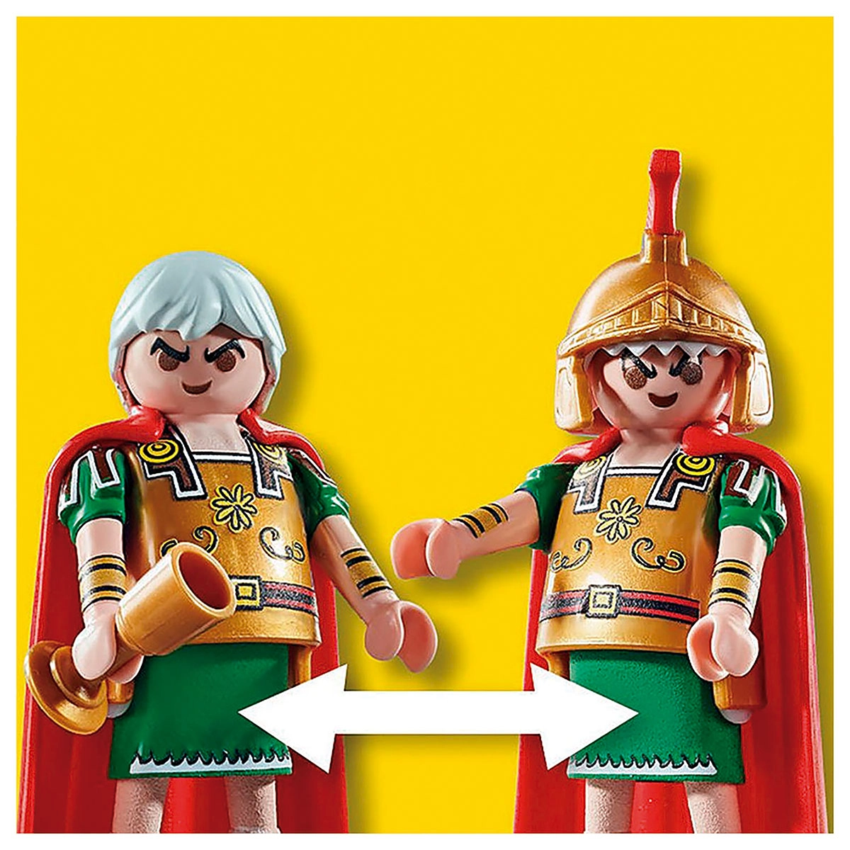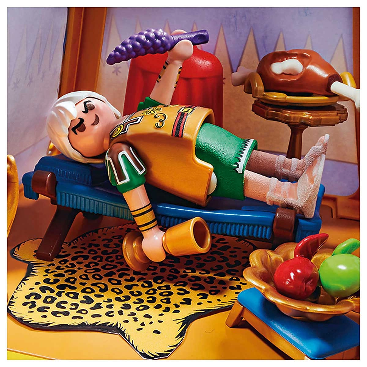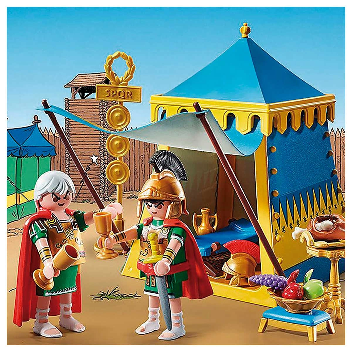 Os generais Gaius Bonus e Marcus Sacapus residem em sua tenda ricamente mobiliada.Um dos passatempos favoritos de Obelix é bater em romanos. Assim que os romanos se aventuram fora de um de seus acampamentos, eles são presas fáceis para a gorda Gália. Mas no momento os dois generais Gaius Bonus e Marcus Sacapus estão conferindo uma nova estratégia para expulsar os indomáveis gauleses de sua aldeia.Eles se sentam na tenda de seu líder ricamente decorada, comendo um pedaço de carne e uma taça de vinho, e pensando no que fazer a seguir.O conjunto PLAYMOBIL contém os generais Gaius Bonus e Marcus Sacapus em armadura com capa e capacete, uma tenda de general com tapete, cama, banco e cadeira e muitos outros extras para aventuras emocionantes.