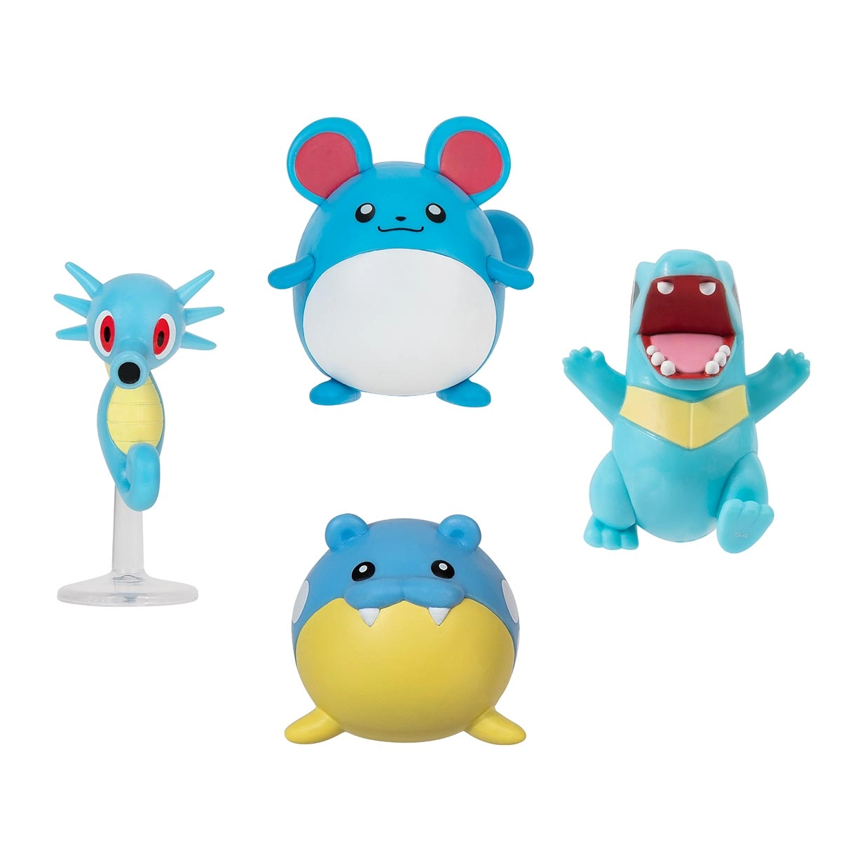 Conjunto com quatro figuras Pokémon de 2 polegadas do tipo Água, incluindo Totodile, Marill, Horsea e Spheal.
