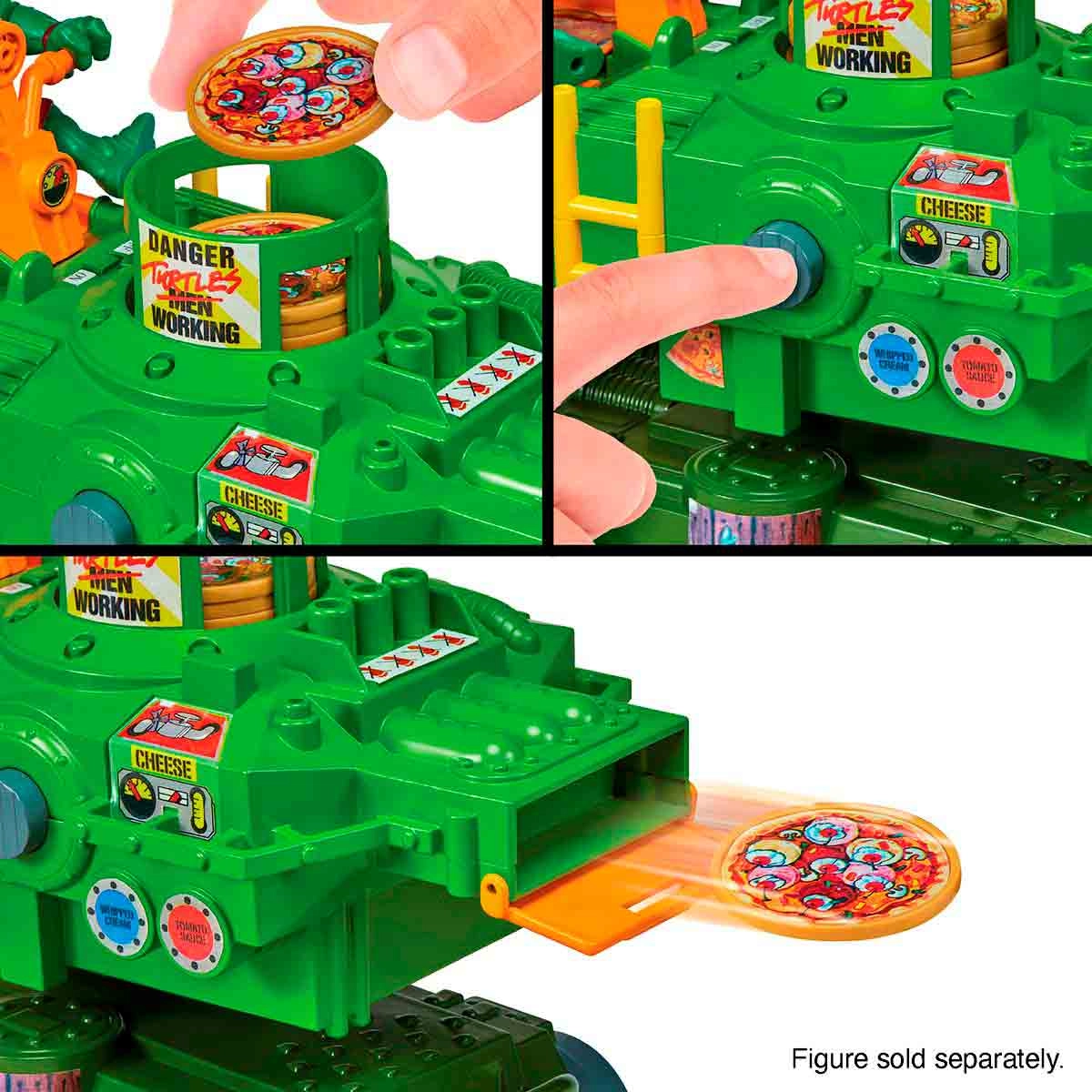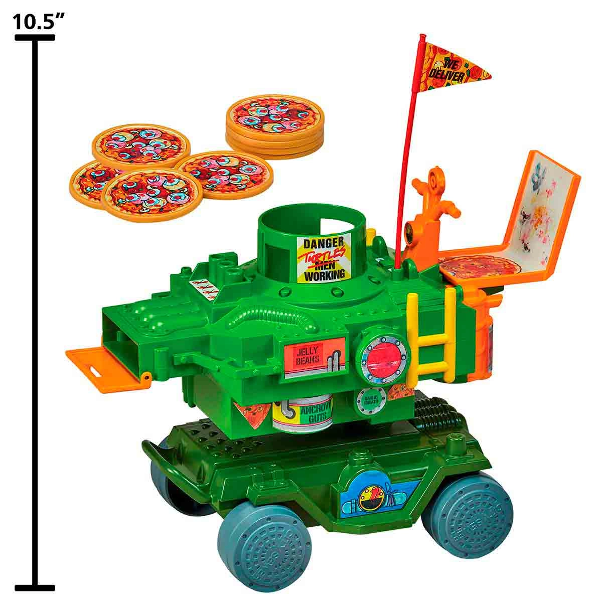 O veículo possui um design robusto e colorido, com as cores verde e laranja predominando, representando as tartarugas e a famosa pizza. A estrutura é inspirada no estilo urbano de Nova York, com detalhes que lembram o espírito aventureiro das Tartarugas Ninja. Ele tem rodas grandes e resistentes, permitindo que as crianças se movam facilmente pelo chão. O grande atrativo do brinquedo é o lançador de pizza , localizado na frente do veiculo. Além do lançador de pizza, o veículo tem um compartimento para armazenar as pizzas extras, permitindo que as crianças recarreguem o lançador durante a diversão. A estética do brinquedo é focada nas características das Tartarugas Ninja, com detalhes gráficos como o emblema da equipe e elementos que lembram o ambiente construído onde eles habitam. O Veículo Lançador de Pizza das Tartarugas Ninja é perfeito para quem ama a série e quer recriar os momentos de ação com uma brincadeira simples, porém cheia de diversão. A principal diversão está em lançar as pizzas e desafiar os amigos em uma batalha de disparos.